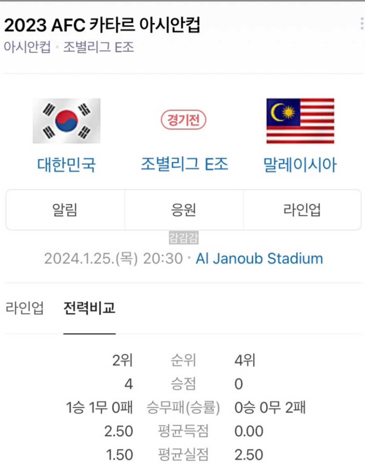 2024년 1월 25일 [대한민국 VS 말레이시아] 카타르 아시안컵 3차전 축구 경기 선수 전적 중계